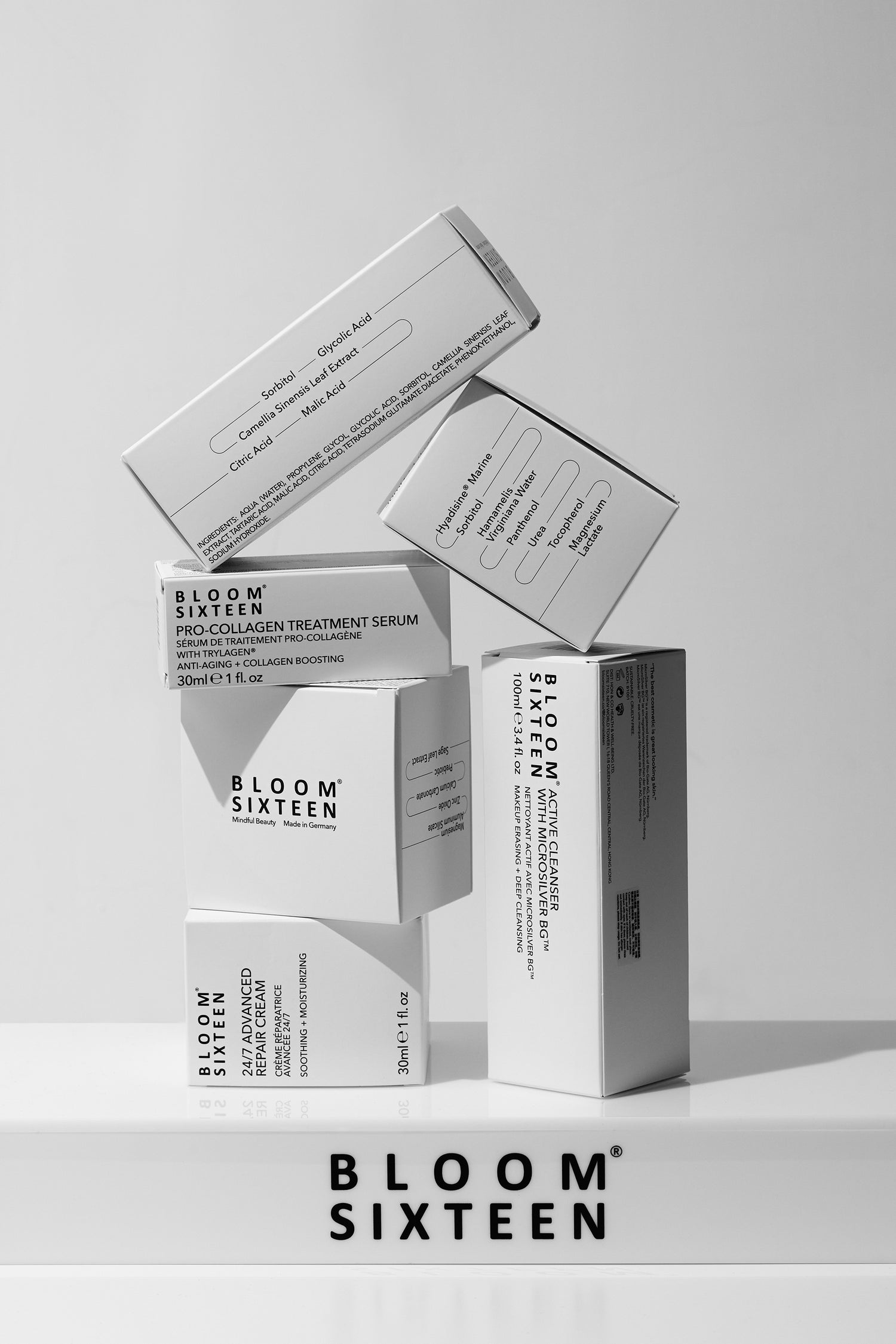 BloomSixteen 的诞生源自一段关于疗愈的故事:创始人 Vicky Xu在2020年初春生第四个宝宝时,由于高危妊娠病发症,虽然脱险,但她的皮肤却因治疗而变得更加敏感。四个宝宝的妈妈和事业型女性的身份,令她分身乏术,皮肤状况也一直无法得到改善。在此期间,她尝试用正念与自己对话,选用天然及可持续的护肤方法,渐渐地,她惊喜地发现自己的压力得到了释放,自己的状态变得更好,皮肤敏感问题也得到了改善。她决定将这个发现推广给更多受压力、肌肤问题的困扰人,BloomSixteen 标志性的高效、温和、天然、正念护肤系列产品由此而诞生。